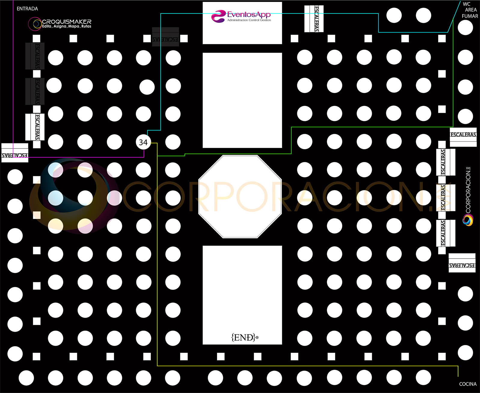 Muestra a tus invitados las diferentes rutas importantes en un evento como son llegar a la mesa en el checkin, dirigirte a las dos amenidas mas importantes area de fumar y WC
